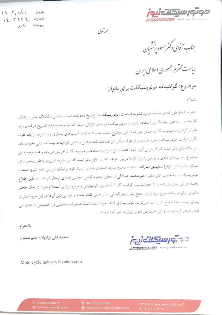 بیشتر بخوانید: محمدعلی نژادیان اولین فردی که گواهینامه موتورسیکلت زنان را در ایران پیگیری کرد
